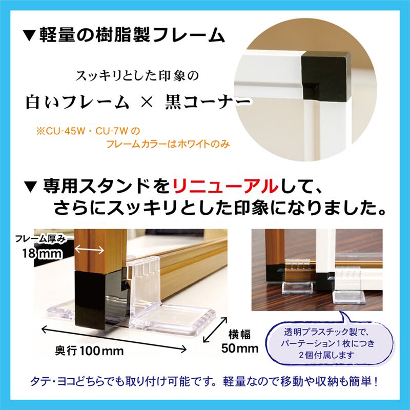 フレーム部分は樹脂製、透明PET板が入っておりますので、軽量のため設置・移動が簡単に行えます。
